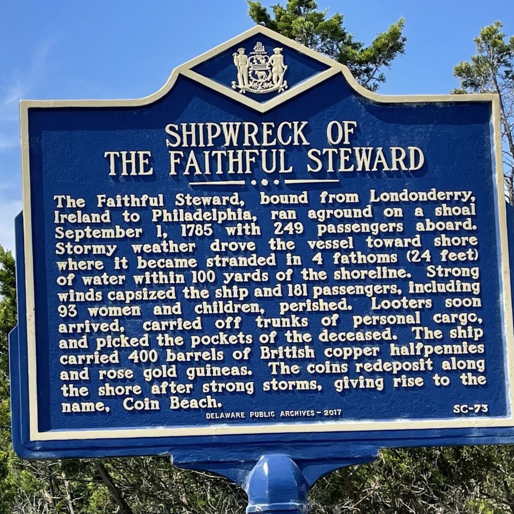The sign reads: The Faithful Steward, bound from Londonderry, Ireland to Philadelphia, ran aground on a shoal September 1, 1785 with 249 passengers aboard.
